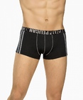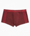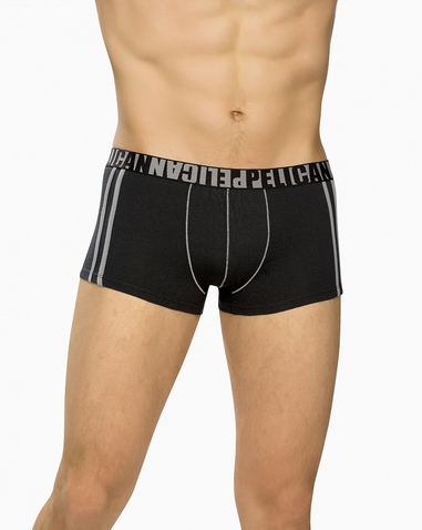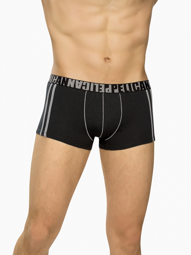 Мужские трусы-шорты в спортивном стиле. Низкая посадка. На передней части изделия по бокам двойные вертикальные полосы из пайпинга. Декоративная отстрочка в области гульфика. По талии широкая тканая резинка в два цвета. Состав: 93%хлопок 7%эластан