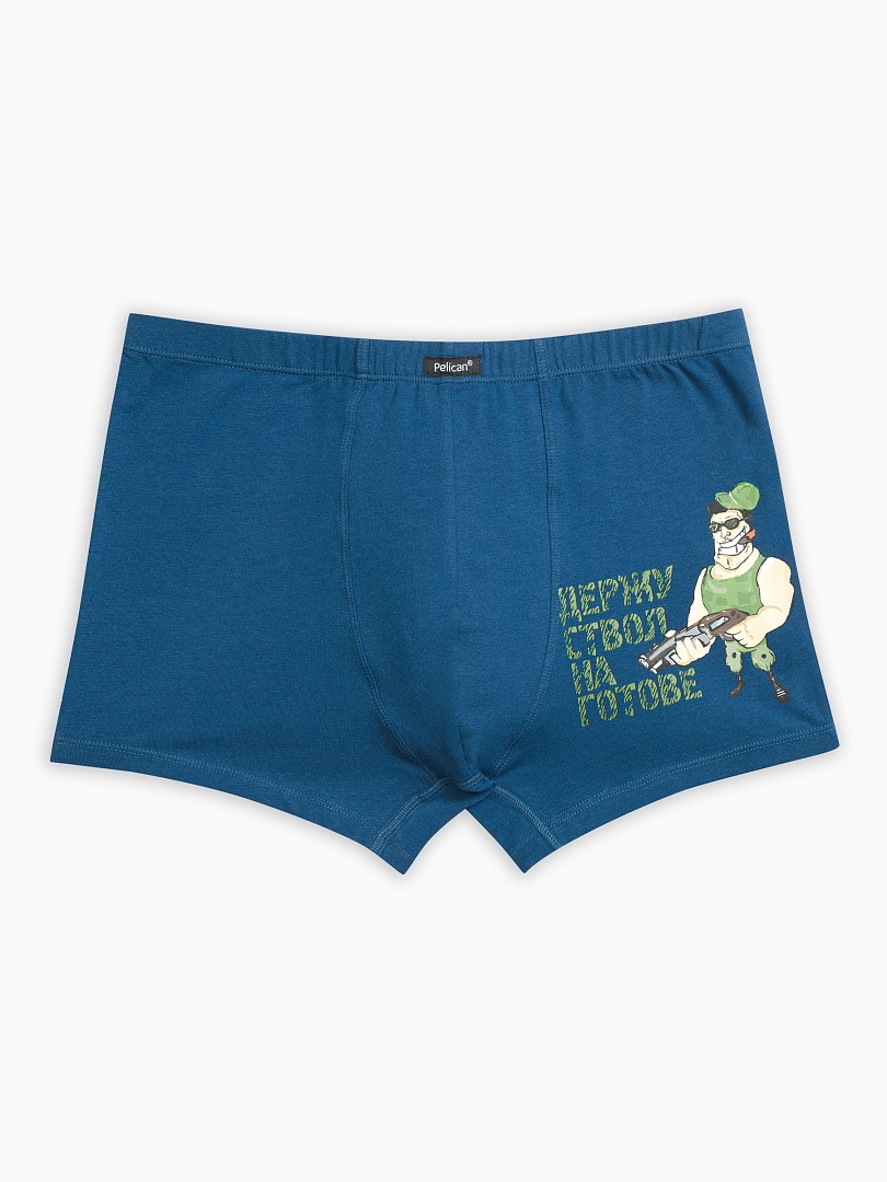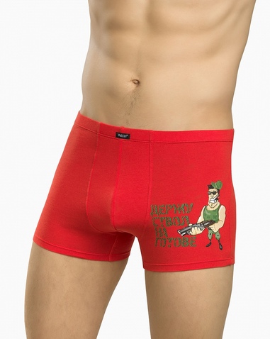 Мужские трусы-шорты. Средняя посадка. Принт на боковой части изделия: спецназовец с ружьём и надпись "Держу ствол наготове". Состав: 93%хлопок 7%эластан