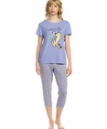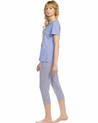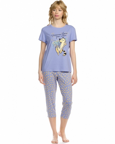 Комплект женский: футболка и бриджи. Футболка прямого кроя среднего объема. Суперстойкий и эластичный принт. Перевод: "Счастье расцветает изнутри". Бриджи комфортного объема. По талии - на плоской широкой резинке, по низу - манжеты шириной 7 см. Состав: верх: 57%хлопок 38%полиэстер 5%эластан, низ: 57%хлопок 38%полиэстер 5%эластан