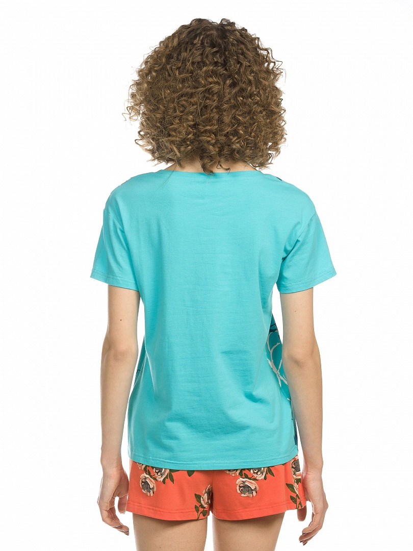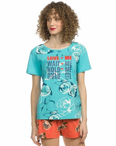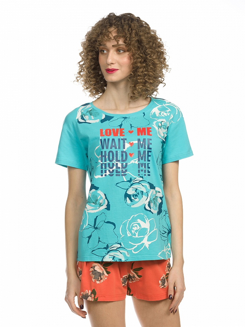 Комплект женский: футболка и шорты. Футболка умеренного объема, слегка спущенное плечо; soft-принт с элементами глянца - мягкий и пластичный. Перевод: "Люби меня, жди меня, обнимай меня". Шорты объемные и короткие на комфортной внутренней резинке. Состав: верх: 95%хлопок 5%эластан, низ: 95%хлопок 5%эластан