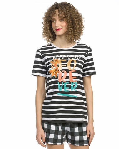Комплект женский: футболка и шорты. Футболка умеренного объема, втачной рукав; принт переливается оттенками металликов; мягкий стойкий soft-принт. Перевод: "Бесконечная любовь навсегда". Шорты комфортного объема на комфортной внутренней резинке. Состав: верх: 57%хлопок 38%полиэстер 5%эластан, низ: 57%хлопок 38%полиэстер 5%эластан