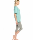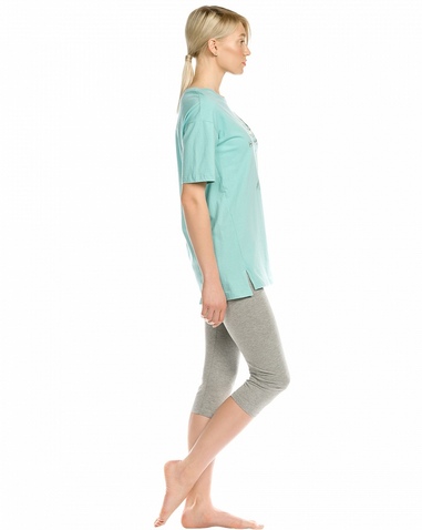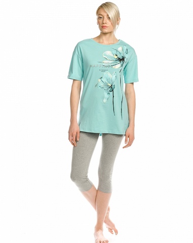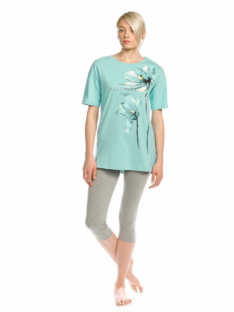 Комплект женский: туника и лосины. Туника комфортного объема, спущенное плечо, свободный рукав. Боковые швы переведены вперед, внизу - небольшие разрезы. Мягкий стойкий soft-принт с деликатным золотистым блеском. Перевод: «Нет счастья, равного спокойствию". Небольшой перепад длин переда и спинки. Лосины из меланжа. Состав: верх: 100%хлопок, низ: 57%хлопок 38%полиэстер 5%эластан