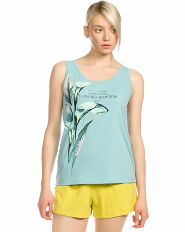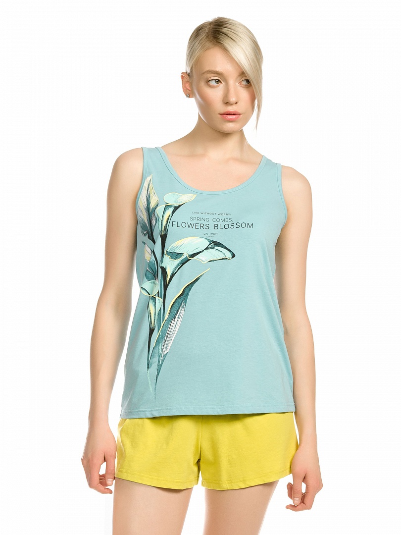 Комплект женский: майка и шорты. Майка комфортного полуприлегающего объема. Мягкий стойкий soft-принт с деликатным золотистым блеском. Перевод: "Весна придет, и цветы распустятся сами". Шорты среднего объема. Состав: верх: 57%хлопок 38%полиэстер 5%эластан, низ: 57%хлопок 38%полиэстер 5%эластан