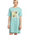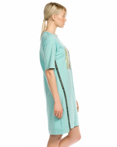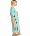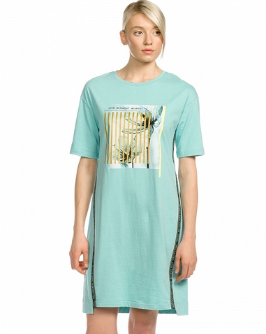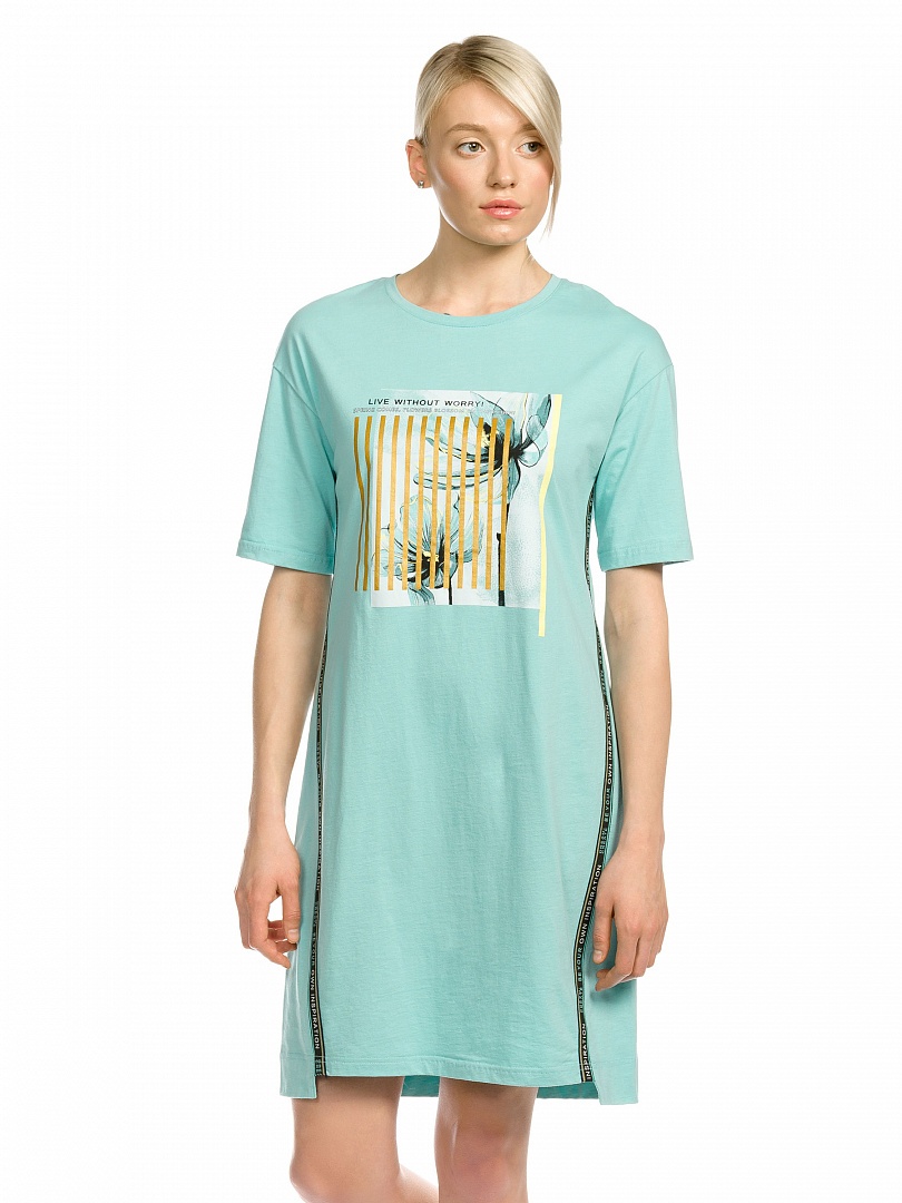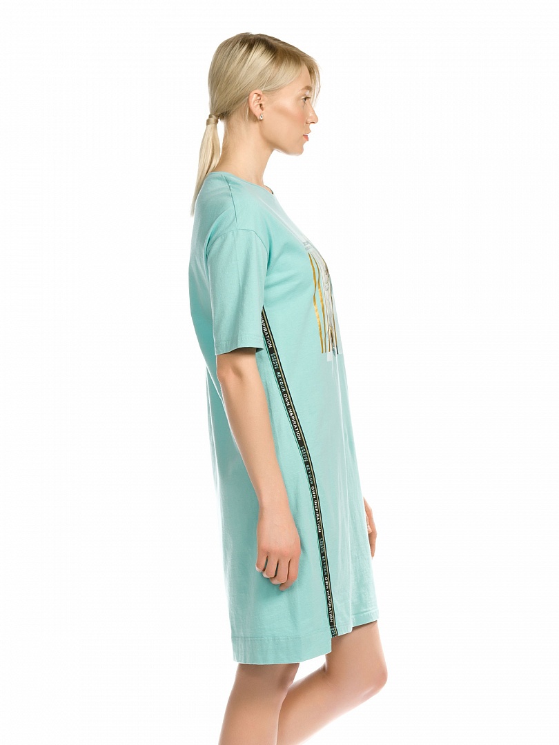 Платье женское. Платье-футболка комфортного объема со спущенной линией плеча. Боковые швы переведены вперед, нашиты контрастные лампасы с текстовым принтом. Центральный мягкий soft-принт с золотыми полосками. Состав: 100%хлопок