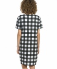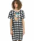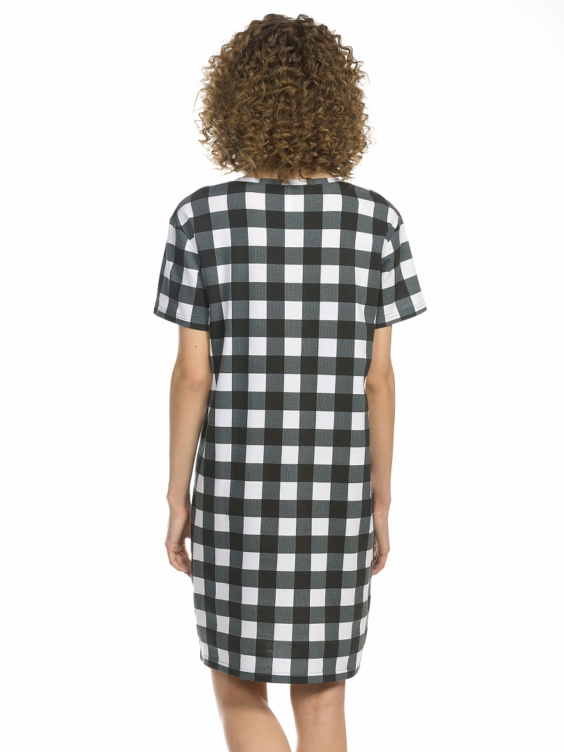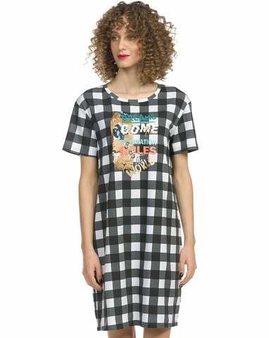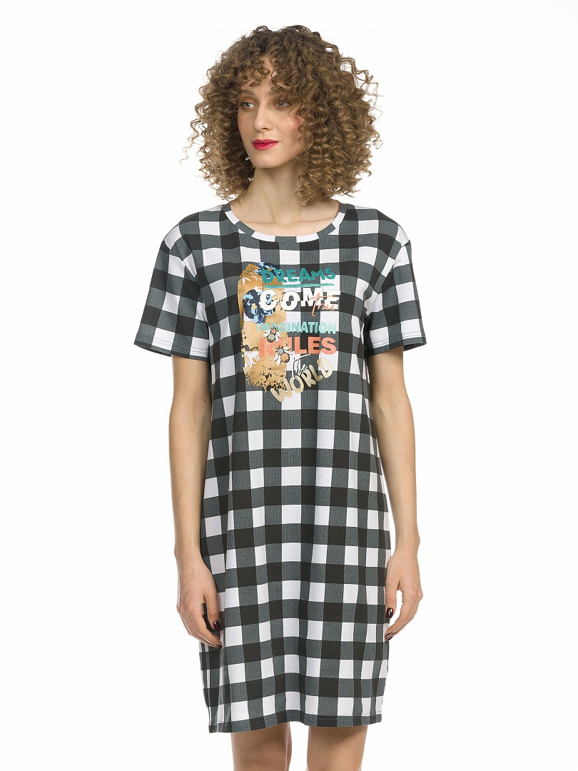 Платье женское. Платье-футболка умеренного объема. На клетчатой фактуре из мягкого стойкого soft-принта - множество мелких деталей, золото и металлизированные оттенки. Перевод: "Мечты сбываются. Воображение правит миром". Состав: 57%хлопок 38%полиэстер 5%эластан