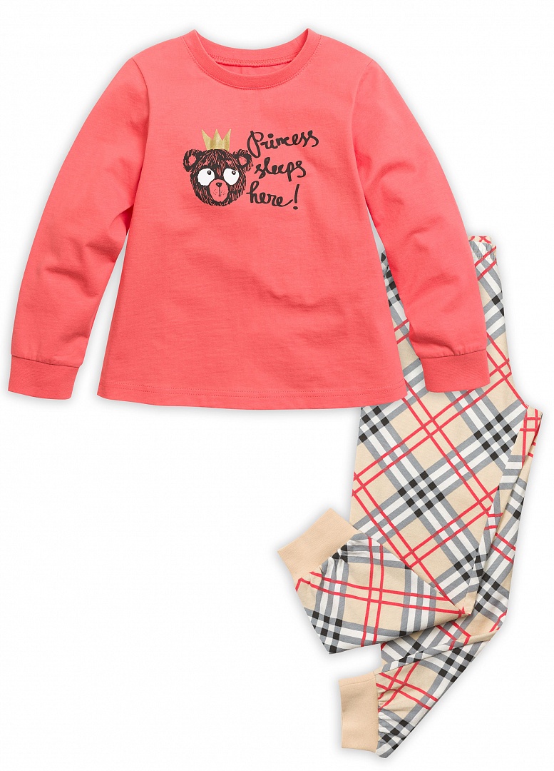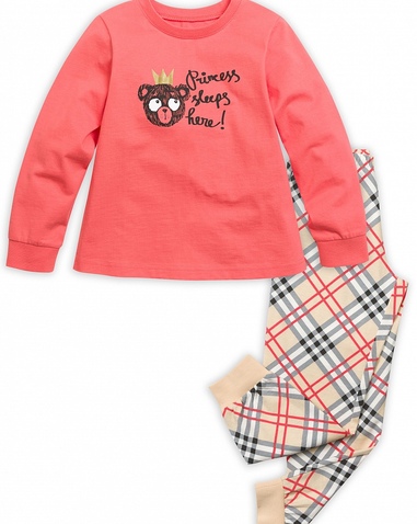 Пижама для девочек: джемпер и брюки. На джемпере центральный принт каррикатурный мишка. Брюки в стильную клетку, манжеты по низу брючин. Состав: верх: 100%хлопок, низ: 100%хлопок