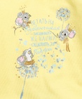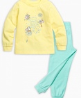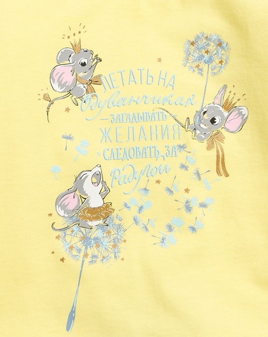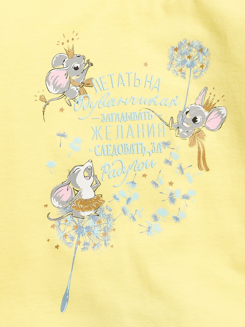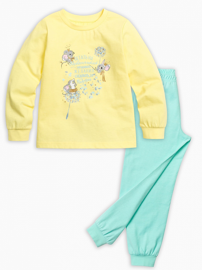 Пижама для девочек: джемпер и брюки. Джемпер выполнен в жёлтом цвете. Центральный принт - мультяшные мышата, парящие на одуванчиках и надпись "Летать на одуванчиках, загадывать желания, следовать за радугой". На рукавах манжеты из основной ткани. Брюки ментолового цвета гармонируют с цветом надписи на джемпере. По поясу изделия внутренняя резинка, по низу - манжеты из основной ткани. Состав: верх: 100%хлопок, низ: 100%хлопок