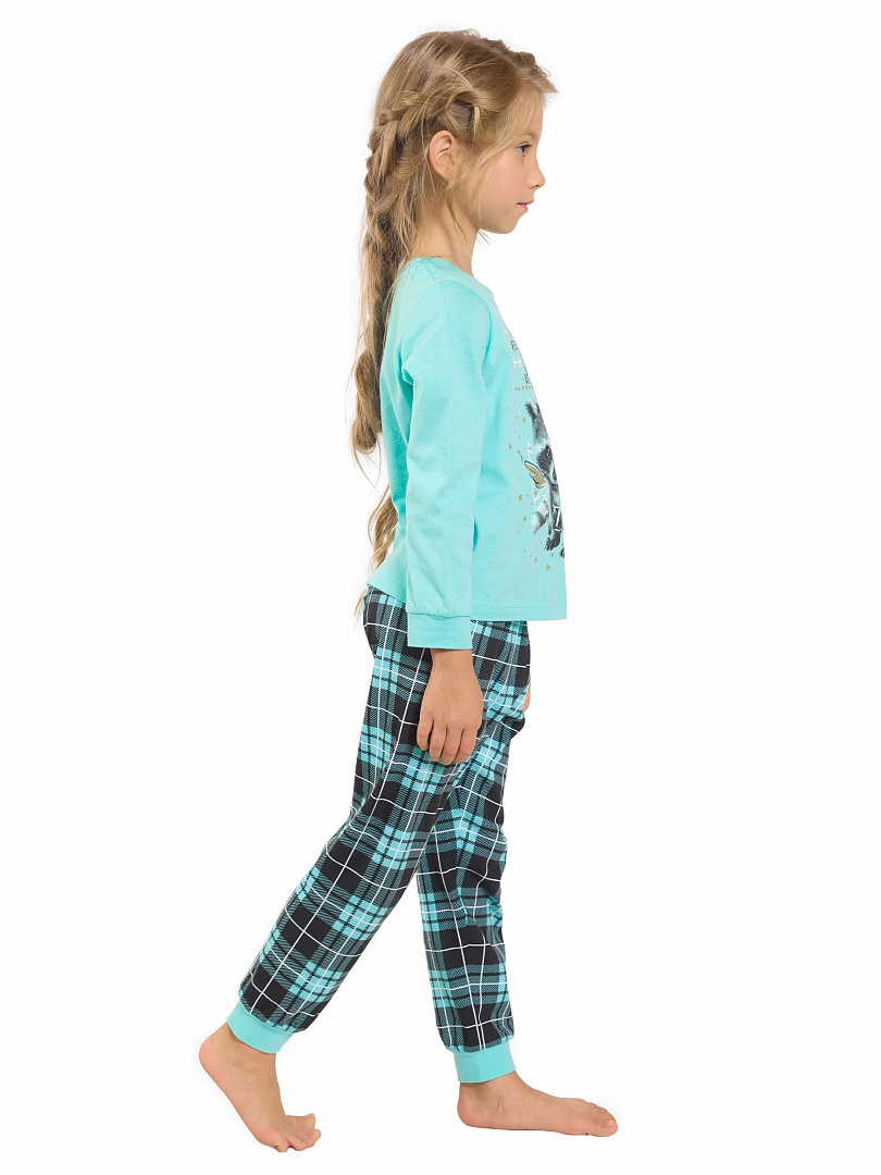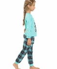 Пижама для девочек: джемпер и брюки. Джемпер модного ментолового цвета. Центральный принт с использованием золота и золотого металлика в виде балдёжного енота и надпись "Нежное беззащитное существо, от которого невозможно спастись!". Отделка горловины и манжеты выполнены из рибаны. Брюки в ментоловую клетку. По низу брючин манжеты из рибаны. Состав: верх: 100%хлопок, низ: 100%хлопок