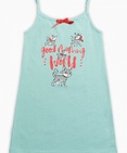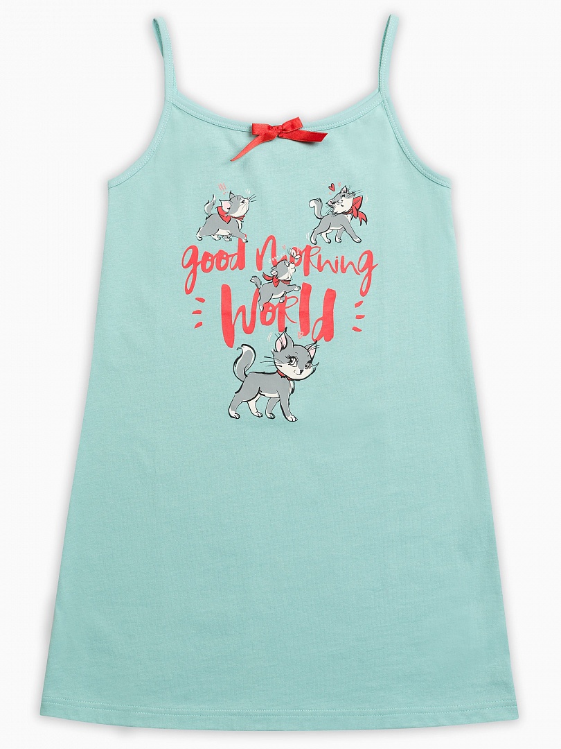 Ночная сорочка для девочек. Сорочка выполнена в лазурном цвете, горловина декорирована изящным бантиком. Центральный принт - жизнерадостные кошечки и надпись (перевод) "Доброе утро, мир!". Состав: 100%хлопок