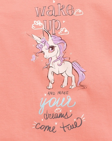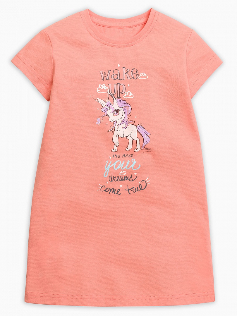 Ночная сорочка для девочек. Сорочка выполнена в нежном персиковом цвете. Центральный принт - волшебный пони и надпись (перевод) "Проснись и воплоти свои мечты". Состав: 100%хлопок