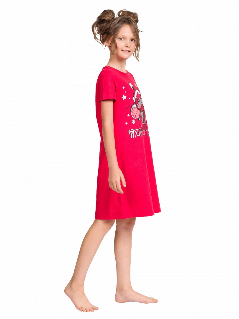 Ночная сорочка для девочек. Платье с коротким рукавом, свободный силуэт. Центральный принт с красным глиттером и фольгированным серебром в виде символа года - мышки. Надпись на английском языке, перевод "Загадай желание!". Горловина обработана рибаной. Состав: верх: 100%хлопок