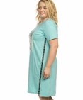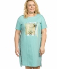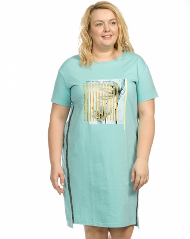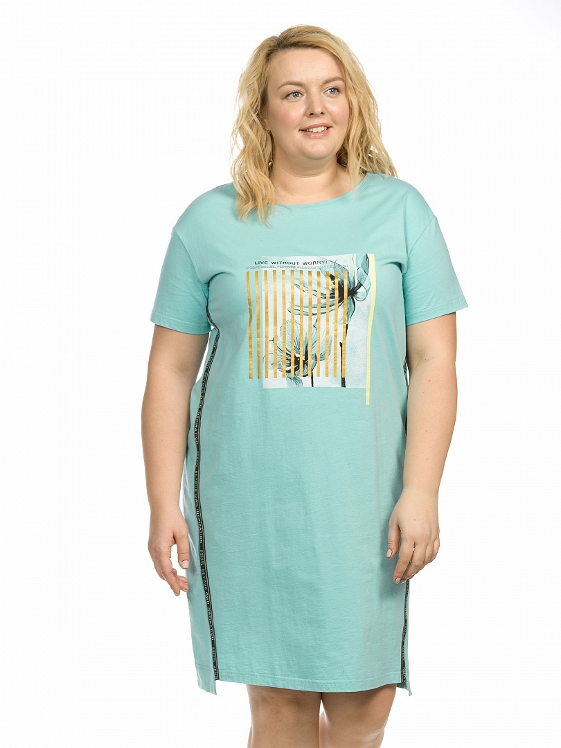 Платье женское. Спущенное плечо, свободная посадка по фигуре. На боковые швы, переведённые вперед, нашита контрастная тесьма с шрифтовым принтом. Перепад длин между спинкой и передом. Мягкий стойкий soft-принт с деликатным золотым блеском. Перевод: "Живи, сохраняя покой. Весна придет, цветы распустятся сами". Состав: 100%хлопок