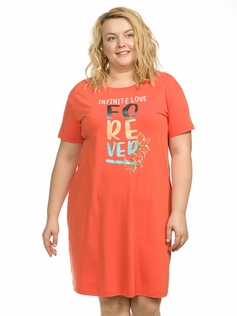 Платье женское. Обновленная модель. Умеренный свободный объем, современный крой рукава, мягкий плечевой пояс. Моно-принт с металлизированными оттенками разных цветов. Перевод: "Бесконечная любовь навсегда". Состав: 57%хлопок 38%полиэстер 5%эластан